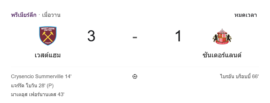 - 🔄 นาที 75 เวสต์แฮมส่งเฟรดดี พ็อตส์ลงแทนกาสตายานญอส ส่วนซันเดอร์แลนด์ส่งวิลสัน อีซิดอร์ลงแทนมายเยนดา