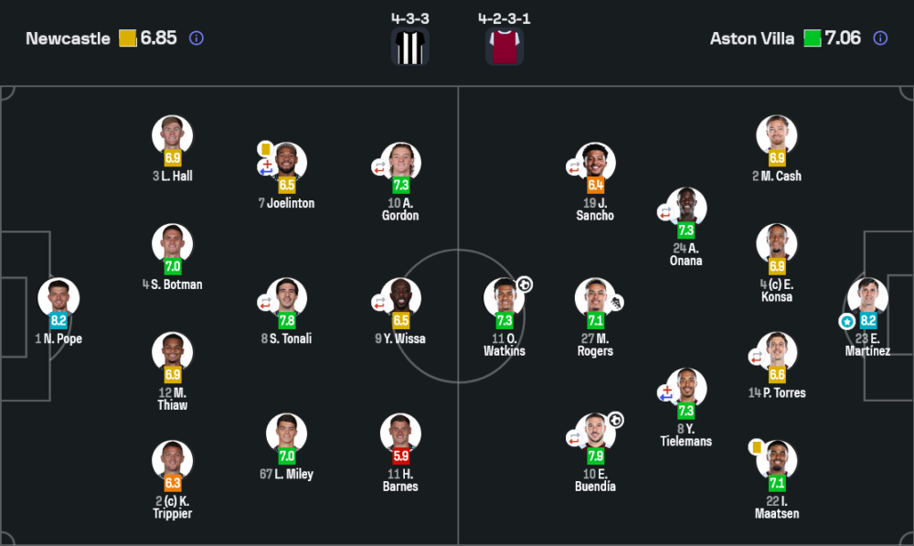 เปิดเกมมาไม่ถึงนาที นิวคาสเซิลลุยใส่ทันที ซานโดร โตนาลี ได้ง้างยิงในเขตโทษแต่ เอมิเลียโน มาร์ติเนซ เซฟแรกของเกมไว้ได้แบบนิ่งๆ จากนั้นเกมเริ่มเดือด ฟาวล์ไล่มาตั้งแต่นาทีที่ 2–7 ทั้งจากเจดอน ซานโช, แมตตี้ แคช และมอร์แกน โรเจอร์ส แสดงให้เห็นว่าแข้งวิลลามาแบบไม่เกรงเจ้าบ้าน