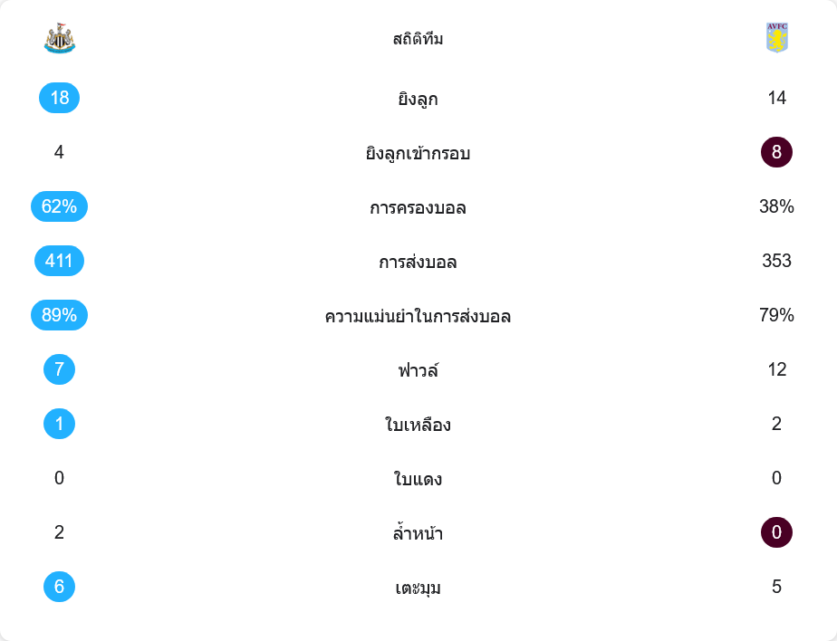 แมตช์นี้นิวคาสเซิลยิงรวม 18 ครั้ง เข้ากรอบ 4 ครั้ง ขณะที่วิลลายิง 14 ครั้ง แต่เข้ากรอบถึง 8 ครั้ง แปลว่าประสิทธิภาพในพื้นที่สุดท้ายของทีมเยือนเหนือกว่าอย่างชัดเจน เจ้าบ้านครองบอล 62% ต่อ 38% จ่ายบอล 411 ต่อ 353 ครั้ง และมีเปอร์เซ็นต์ผ่านบอลแม่น 89% เหนือกว่าวิลลาที่ 79% แต่เมื่อมองจำนวนฟาวล์และใบเหลือง วิลลาทำฟาวล์มากกว่า 12 ต่อ 7 และโดนใบเหลือง 2 ใบ (ลูคัส ดีญ, เอียน มาตเซน) ขณะที่นิวคาสเซิลโดนแค่ใบเดียวจากโจลินตัน แสดงให้เห็นว่าทีมเยือนเล่นเกมรับแบบดุดัน เน้นหยุดจังหวะตั้งแต่กลางสนาม ลูกเตะมุมเป็นอีกตัวเลขสำคัญ เจ้าบ้านได้ 6 ครั้ง วิลลา 5 ครั้ง แต่ทีมที่ใช้ประโยชน์ได้จริงคือวิลลาซึ่งทำประตูปิดเกมจากลูกเตะมุมในช่วงท้าย