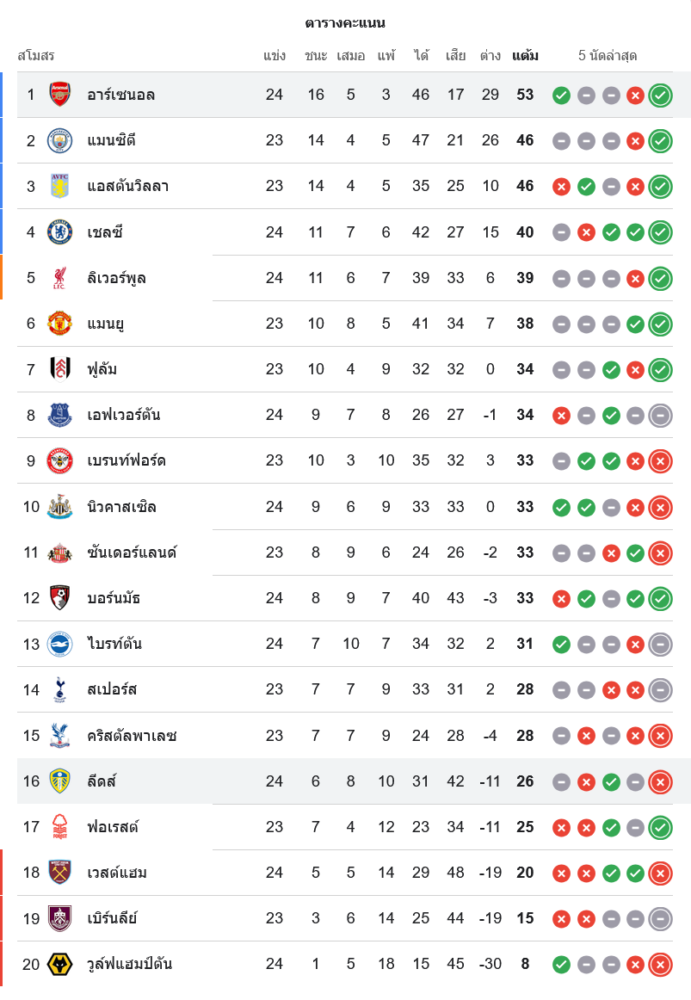 📈 สถานการณ์ในตารางคะแนนพรีเมียร์ลีก อังกฤษ