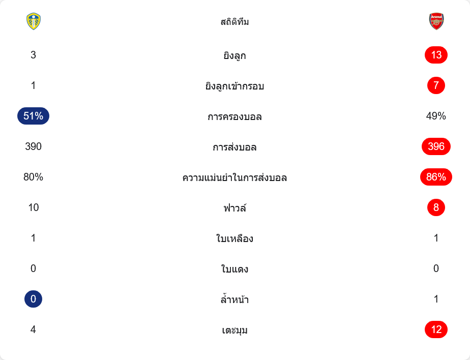 ตัวเลขหลังเกมบอกเรื่องราวได้ดี แม้ลีดส์จะครองบอลมากกว่าที่ 51% ต่อ 49% แต่ตลอด 90 นาทีเจ้าถิ่นยิงเพียง 3 ครั้ง เข้ากรอบแค่ 1 ครั้ง สวนทางกับอาร์เซนอลที่สร้างโอกาสได้ถึง 13 ครั้ง เข้ากรอบ 7 หน แสดงให้เห็นถึงคุณภาพการเข้าทำที่เฉียบคมกว่าชัดเจน ทั้งสองทีมมีจำนวนการผ่านบอลใกล้เคียงกัน 390 ต่อ 396 ครั้ง แต่ความแม่นยำของปืนใหญ่อยู่ที่ 86% สูงกว่าลีดส์ที่ 80% ทำให้การครองบอลของทีมเยือนมีประสิทธิภาพกว่าอย่างเห็นได้ชัด