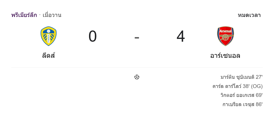 - 🔁 นาที 81 – ลีดส์ส่ง วิลฟรีด กนอนโต้ แทน อันตอน ชตัค ขณะที่อาร์เซนอลถอด เลอันโดร ทรอสซาร์ ส่ง เอเบเรชี เอเซ ลงไปเชื่อมเกมรุก