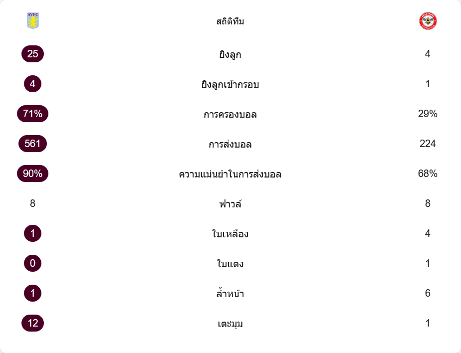 แมตช์นี้ตัวเลขหลังเกมเทไปทางแอสตัน วิลล่าอย่างชัดเจน เจ้าบ้านลุยยิงทั้งหมด 25 ครั้ง เข้ากรอบ 4 ครั้ง ขณะที่เบรนท์ฟอร์ดมีโอกาสแค่ 4 ครั้ง เข้ากรอบเพียง 1 และกลายเป็นประตูชัยลูกนั้นเอง วิลล่าครองบอลสูงถึง 71% ต่อ 29% ส่งบอลสำเร็จ 561 ต่อ 224 ครั้ง อัตราความแม่นยำ 90% ต่อ 68% เรียกได้ว่าคุมจังหวะทุกอย่างในสนาม