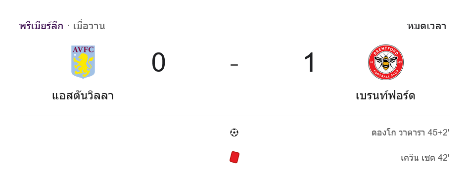 ศึกพรีเมียร์ลีกที่วิลล่า พาร์ค กลายเป็นค่ำคืนสุดขมของสาวกสิงห์ผงาด เมื่อแอสตัน วิลล่า ครองบอลรุกใส่แทบทั้งเกม ยิงไปถึง 25 ครั้ง แต่สุดท้ายต้องพ่ายให้กับความเฉียบคมของเบรนท์ฟอร์ด 0-1 จากประตูโทนของดองโก วาตารา แถมยังได้เปรียบตัวผู้เล่นตั้งแต่นาที 42 อีกต่างหาก ทำเอาคอบอลที่กดเช็ก ผลบอลสด กันสด ๆ ถึงกับงงว่าเจ้าบ้านยิงทิ้งยิงขว้างกันยังไงถึงออกมาแบบนี้