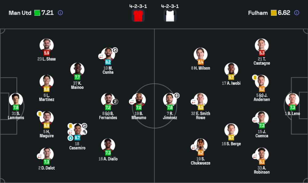 แม้จะโดนเปลี่ยนออกช่วงกลางครึ่งหลัง แต่ค่ำคืนนี้ชื่อของคาเซมิโร่คือหัวใจของแมนยูอย่างแท้จริง ได้คะแนนสูงสุด 8.7 จากการยิงหนึ่ง จ่ายหนึ่ง คุมจังหวะกลางสนาม และช่วยตัดเกมรุกของฟูแล่มหลายครั้ง จังหวะโฉบขึ้นมายิงประตูแรกเปิดหัวทำให้เกมไหลลื่น ฝั่งตัวประกบถึงกับตามไม่ทัน
