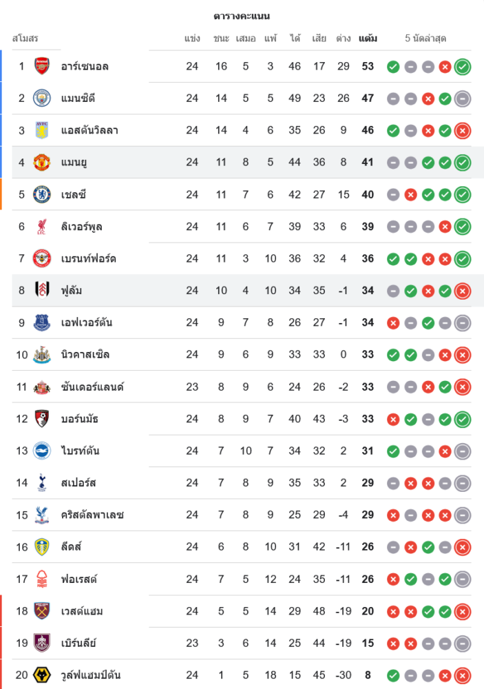 ส่วนฟูแล่มแพ้เกมสำคัญแต่ยังเกาะกลุ่มบนของตารางด้วย 34 แต้มจาก 24 นัด รั้งอันดับ 8 เท่ากับเอฟเวอร์ตันที่มี 34 แต้มเช่นกัน แต่ลูกได้เสียของทีมเจ้าสัวน้อยยังเป็น -1 ถือว่าอยู่ในโซนกลางตารางที่พร้อมดีดขึ้นไปลุ้นพื้นที่ยุโรป ถ้ารักษาฟอร์มช่วงโค้งท้ายฤดูกาลได้ดี