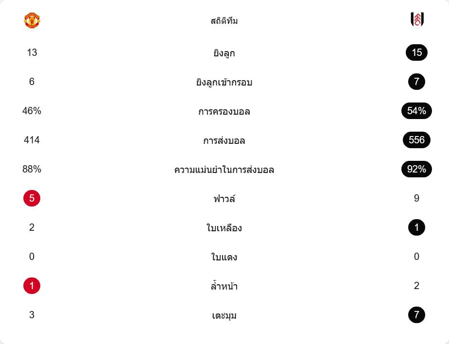 ลูกล้ำหน้า ยูไนเต็ดโดนจับ 1 ครั้ง ขณะที่ฟูแล่มโดน 2 ครั้ง และลูกเตะมุมเป็นของทีมเยือนถึง 7 ครั้ง มากกว่าเจ้าถิ่นที่ได้เพียง 3 ซึ่งตอกย้ำว่าจังหวะกดดันในพื้นที่สุดท้ายของฟูแล่มมาเป็นระลอกๆ ตลอดครึ่งหลัง