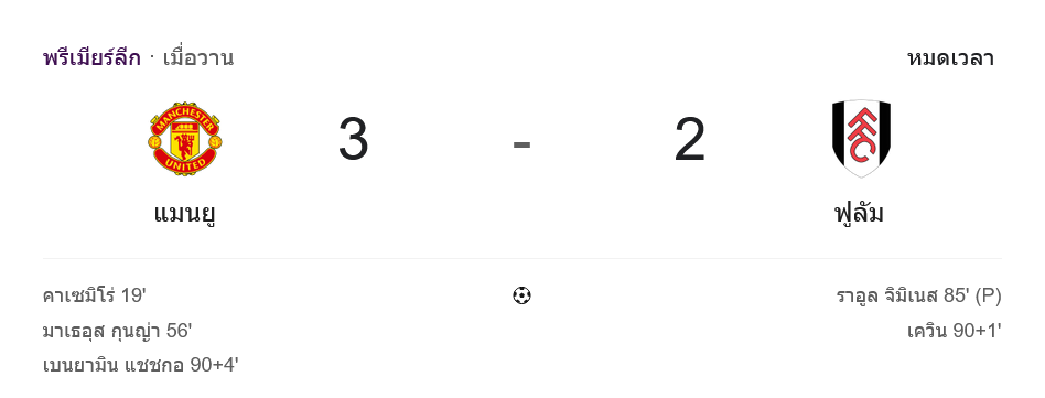 ศึกพรีเมียร์ลีกที่โอลด์ แทรฟฟอร์ด คราวนี้แฟนผีได้เสพ ผลบอลสด แบบหัวใจจะวาย บ้านกีฬา นั่งดูแล้วบอกเลยว่าเกมนี้ครบทุกอารมณ์ ทั้งนำขาด โดนไล่ทัน แล้วปิดท้ายด้วยดราม่านาทีบาปก่อนเฮสนั่นโรงละครแห่งความฝัน เมื่อแมนเชสเตอร์ ยูไนเต็ด เปิดบ้านเฉือนฟูแล่ม 3-2 จากประตูสำคัญของคาเซมิโร่, มาธิอุส กุนญ่า และเบนฌามิน แซร์โค ขณะที่ทีมเยือนได้จากจุดโทษของราอูล ฆิเมเนซ กับลูกยิงของเควิน ช่วงทดเวลา