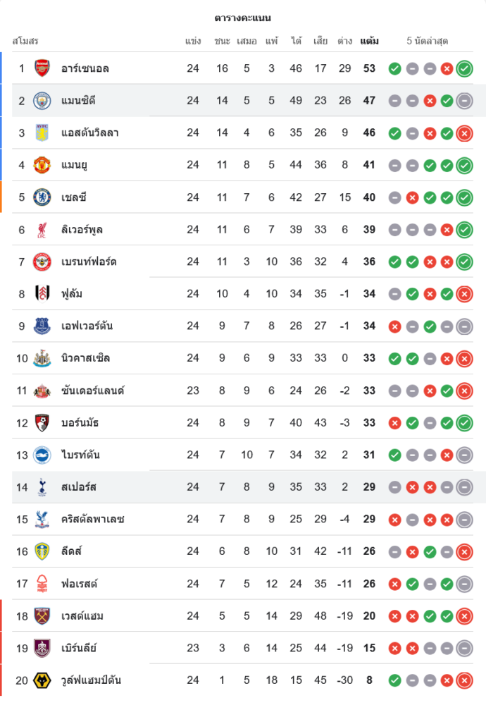 🧮 สถานการณ์ในตารางคะแนนพรีเมียร์ลีก