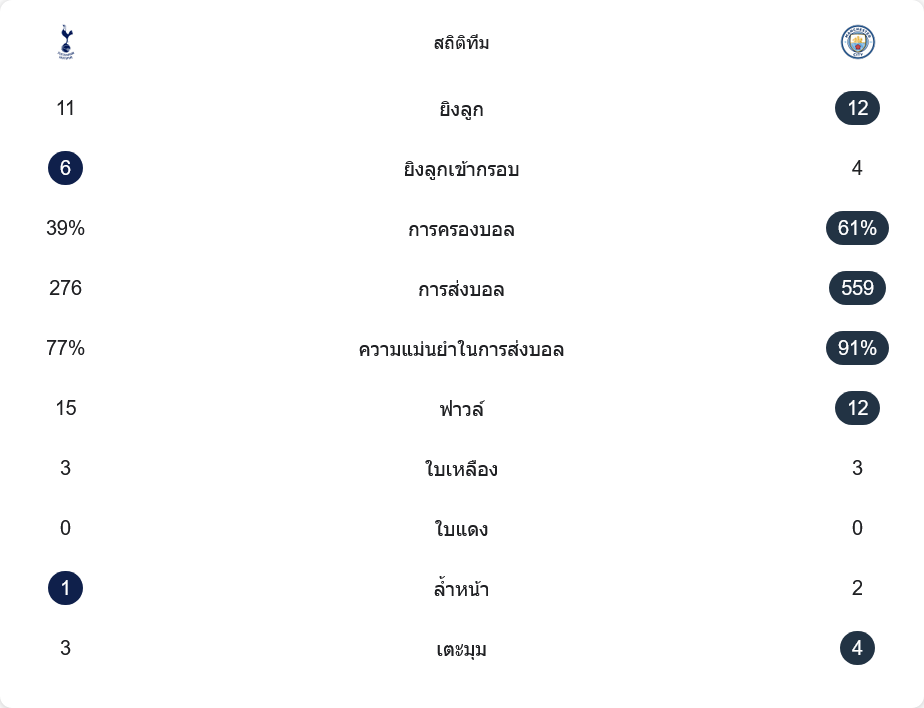 ตัวเลขหลังเกมยืนยันว่าซิตี้เป็นฝ่ายคุมจังหวะได้เหนือกว่าชัดเจน พวกเขาครองบอล 61% ต่อ 39% ส่งบอลมากถึง 559 ครั้ง ขณะที่สเปอร์สทำได้ 276 ครั้งเท่านั้น ความแม่นยำในการจ่ายก็เด่นกว่า 91% ต่อ 77% แสดงให้เห็นระบบการต่อบอลที่ยังลื่นไหลเป็นเครื่องหมายการค้าของเรือใบสีฟ้า