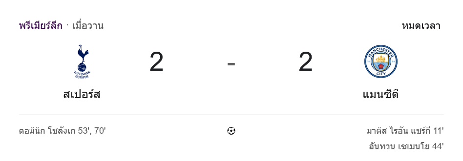 จาก : ผลบอลสด พรีเมียร์ลีก อังกฤษ ระหว่าง สเปอร์ส 2-2 แมนซิตี้ วันนี้ 1/2/69 – บ้านกีฬา