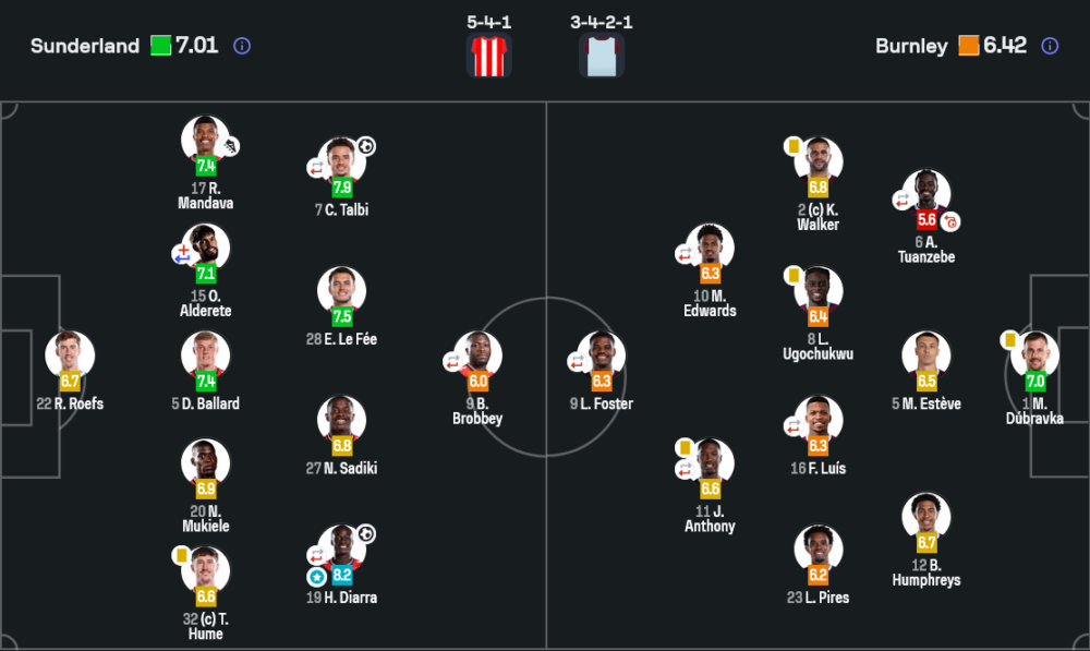 รางวัลแข้งยอดเยี่ยมของเกมนี้ตกเป็นของแฮบีบ ดียาร์ร่า แบบไร้ข้อโต้แย้ง คะแนนเรตติ้ง 8.2 สะท้อนทุกอย่าง เจ้าตัวเป็นหัวใจของเกมรุกซันเดอร์แลนด์ ทั้งวิ่งไล่เพรสไม่หยุด ลากเลื้อยกินตัวคู่แข่ง และหาจังหวะสอดขึ้นมายิงเองได้ตลอด ประตู 2-0 ที่เจ้าตัวซัดเองคือจังหวะเปลี่ยนหน้าเกมสำคัญ เพราะทำให้เบิร์นลีย์ต้องเปิดหน้าบุกและปล่อยพื้นที่ว่างเพิ่มขึ้นอีกเพียบ บ้านกีฬา มองว่าถ้าดียาร์ร่าเล่นได้มาตรฐานแบบนี้ต่อเนื่อง ชื่อของเขาจะถูกพูดถึงในระดับท็อปของลีกแน่นอน