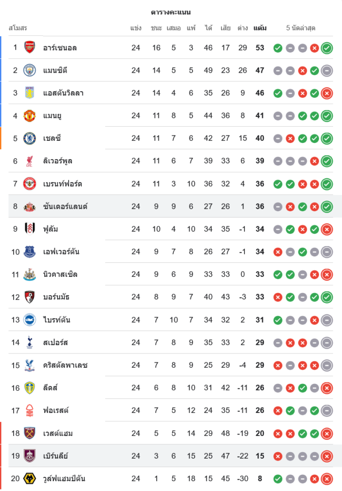 📋 สถานการณ์ในตารางคะแนนพรีเมียร์ลีก อังกฤษ