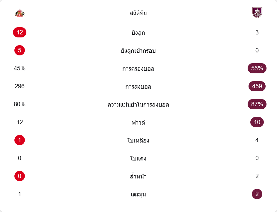 ตัวเลขหลังเกมยืนยันภาพในสนามชัดเจน ซันเดอร์แลนด์ยิงทั้งหมด 12 ครั้ง เข้ากรอบ 5 ครั้ง เปลี่ยนเป็น 3 ประตูเต็ม ๆ ในขณะที่เบิร์นลีย์มีโอกาสยิงแค่ 3 ครั้ง และไม่มีสักลูกที่ตรงกรอบ แม้ทีมเยือนจะครองบอลมากกว่า 55% ต่อ 45% จ่ายบอลสำเร็จถึง 87% จากทั้งหมด 459 ครั้ง เทียบกับเจ้าถิ่นที่จ่ายสำเร็จ 80% จาก 296 ครั้ง แต่เมื่อจังหวะจบสกอร์ไร้ประสิทธิภาพ การครองบอลก็แทบไม่ช่วยอะไร