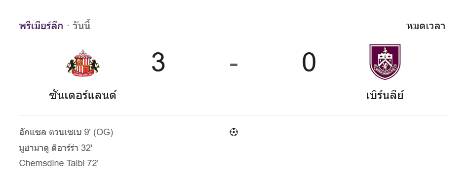 พรีเมียร์ลีก อังกฤษ ค่ำคืนนี้แฟนแมวดำที่สเตเดี้ยมออฟไลท์ได้เฮลั่นทั้งเมือง เมื่อซันเดอร์แลนด์เปิดบ้านไล่บดเบิร์นลีย์แบบหมดรูป 3-0 เกมนี้แฟนที่ตามเช็ก ผลบอลสด และรายงานจาก บ้านกีฬา เห็นภาพชัดเจนว่าเจ้าถิ่นมาเน้นรัดกุมแต่โหดคมทุกจังหวะ ในขณะที่ทีมเยือนครองบอลมากกว่าแต่แทบไม่มีพิษสงให้ลุ้นประตูเลย