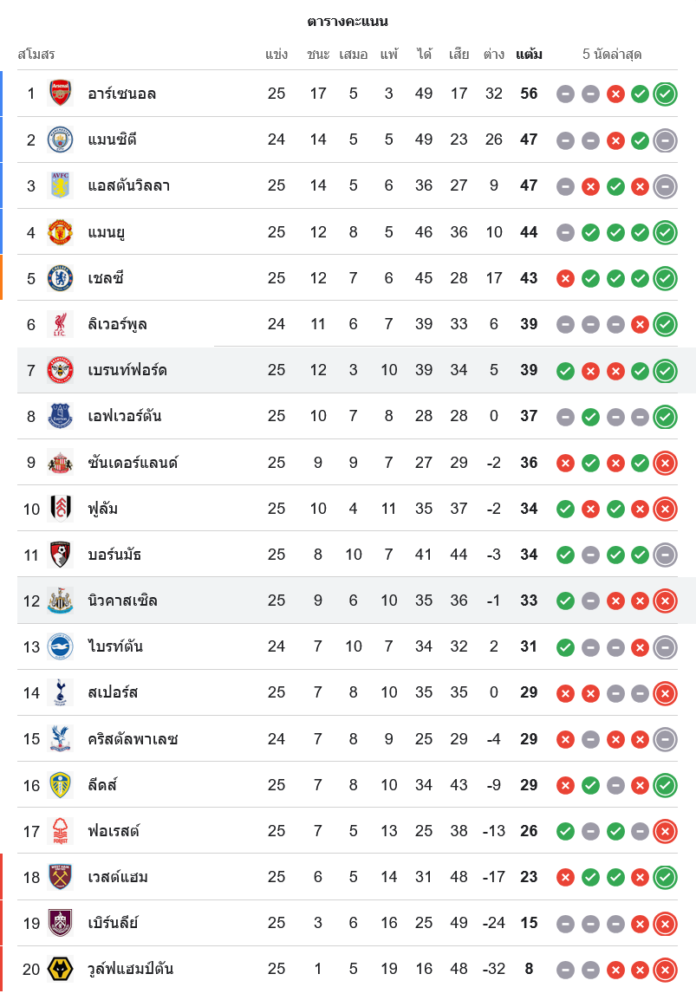 📌 สถานการณ์บนตารางคะแนนพรีเมียร์ลีก