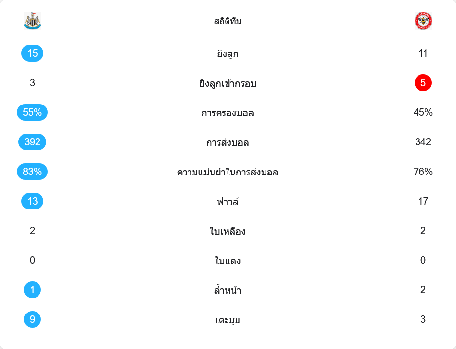 ตัวเลขหลังเกมสะท้อนรูปเกมได้อย่างดี นิวคาสเซิลครองบอลมากกว่า 55% ต่อ 45% จ่ายบอล 392 ครั้ง ความแม่นยำ 83% ขณะที่เบรนท์ฟอร์ดจ่าย 342 ครั้ง แม่นยำ 76% แม้จะเสียบอลมากกว่าแต่ทุกครั้งที่หลุดขึ้นมาได้ ทีมเยือนกลับสร้างความอันตรายได้ชัดเจนกว่า