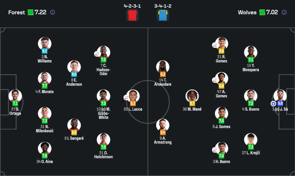เกมรับของวูล์ฟส์ถูกออกแบบให้ทุกลูกยิงต้องผ่านมือซาก่อนเสมอ และเมื่อผู้รักษาประตูโชว์ฟอร์มเทพอย่างคืนนี้ แผน “ยอมโดนล้อมแต่ไม่ยอมเสีย” ก็ทำงานเต็มที่กลับบ้านพร้อมหนึ่งแต้ม ส่วนเกมรุกทีมเยือนอาศัยการตัดบอลแล้วแทงสวนไปที่มาเน่และคู่หน้า แต่โดนฟอเรสต์ตัดจังหวะได้บ่อย ทำให้จำนวนโอกาสจบสกอร์เพียง 7 ครั้ง ดูน้อยเมื่อเทียบกับความต้องการชัยชนะ