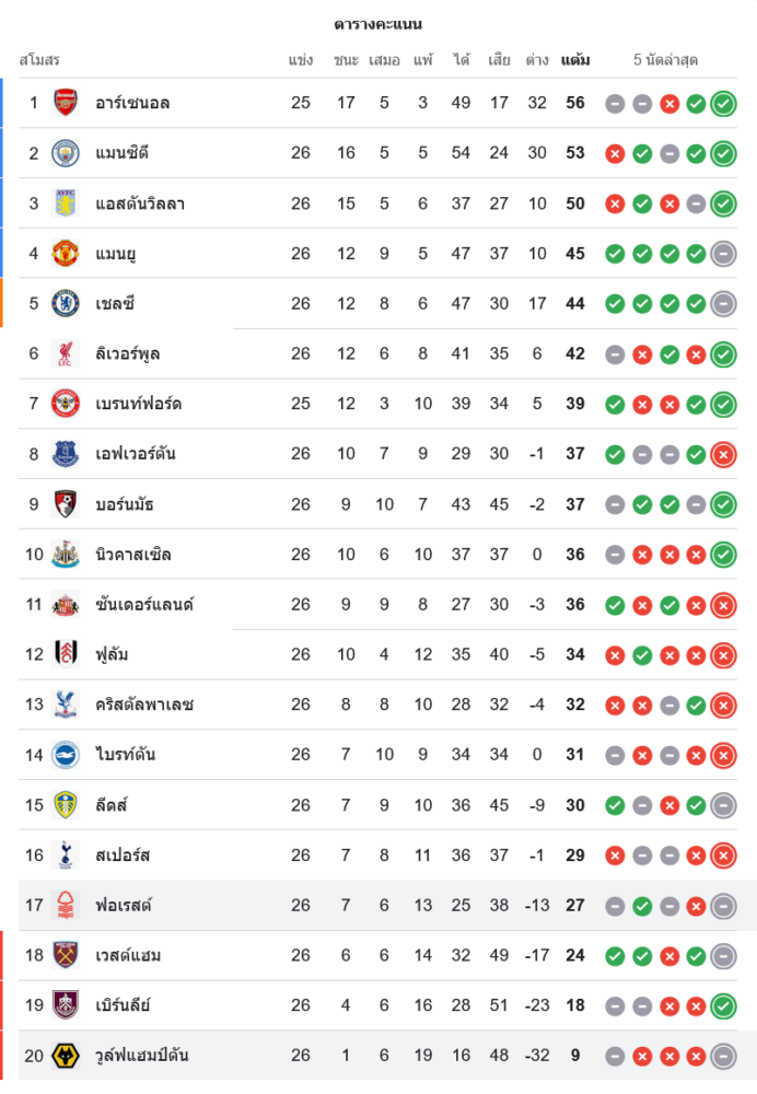 📉 สถานการณ์บนตารางคะแนนพรีเมียร์ลีก