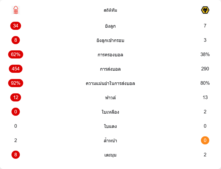 ตัวเลขหลังเกมบอกทุกอย่าง ฟอเรสต์ครองบอลถึง 62% ต่อ 38% ของวูล์ฟส์ ส่งบอลสำเร็จ 454 ต่อ 290 ครั้ง ความแม่นยำในการส่งบอลเจ้าถิ่นสูงถึง 92% ขณะที่ทีมเยือนอยู่ที่ 80% เท่านั้น ฝั่งฟอเรสต์กดดันด้วยการยิงทั้งหมด 34 ครั้ง เข้ากรอบ 8 ส่วนวูล์ฟส์ยิงเพียง 7 ครั้ง เข้ากรอบ 3