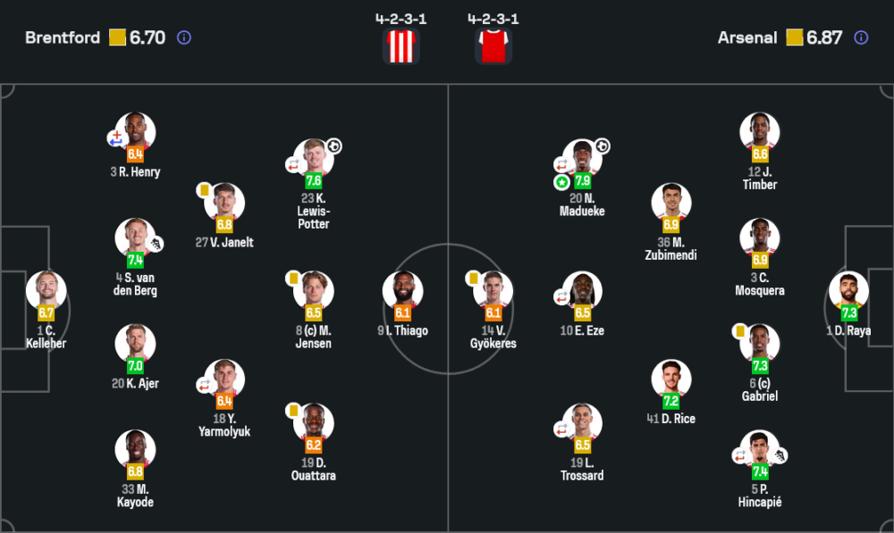 - 🔁 นาที 73 – เบรนท์ฟอร์ดส่ง จอร์แดน เฮนเดอร์สัน และ มิเกล ดัมส์การ์ด ลงมาเสริมแดนกลาง