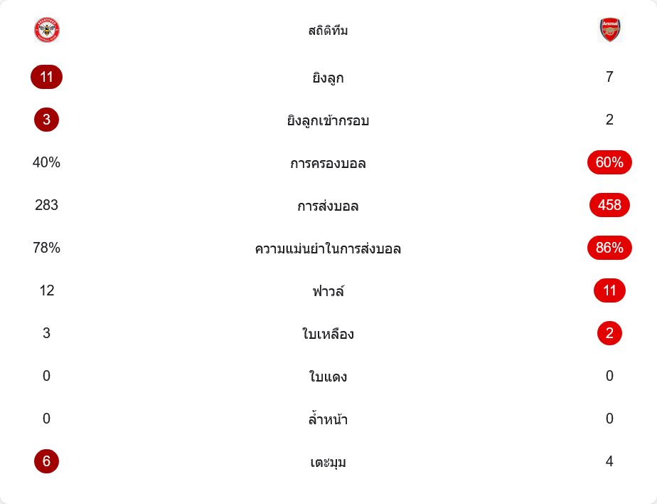 ตัวเลขหลังเกมบอกชัดว่าอาร์เซนอลเป็นฝ่ายครองบอลเหนือกว่า การครองบอลของทีมเยือนอยู่ที่ราว 60% ต่อ 40% ของเจ้าบ้าน พร้อมจำนวนการผ่านบอลราว 458 ครั้ง เทียบกับเบรนท์ฟอร์ด 283 ครั้ง และมีความแม่นยำในการส่งบอลสูงถึง 86% ขณะที่เจ้าบ้านอยู่ที่ประมาณ 78%