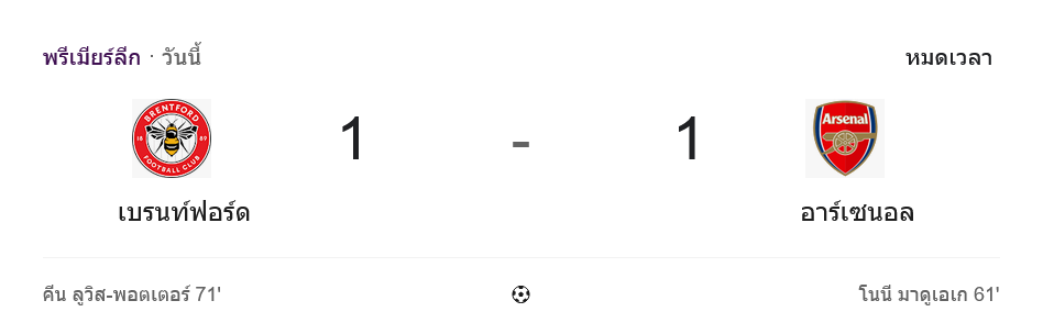 ศึกพรีเมียร์ลีก อังกฤษ ที่จีเทค คอมมูนิตี้ สเตเดี้ยม จบลงด้วยผลเสมอสุดเดือด เบรนท์ฟอร์ด เปิดบ้านไล่ตามตีเสมอ อาร์เซนอล 1-1 ทำให้จ่าฝูงพลาดเก็บสามแต้มเต็มในเกมที่แฟนบอลทั้งสองฝั่งเช็ก ผลบอลสด กันแบบลุ้นจนวินาทีสุดท้าย บ้านกีฬา ขอสรุปเกมนี้แบบจัดเต็มทั้งอารมณ์และแท็กติก