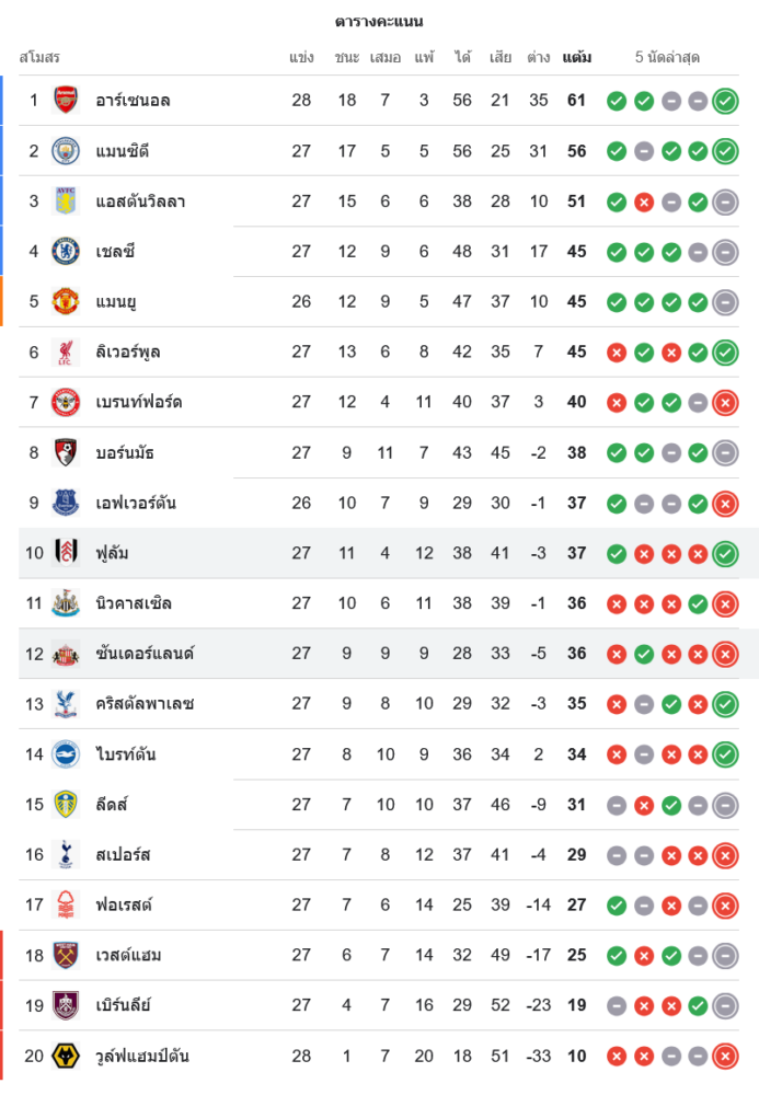 สถานการณ์ในตารางคะแนนพรีเมียร์ลีก
