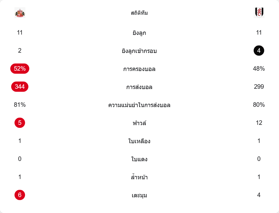 รูปเกมไม่ได้ขาดแบบที่สกอร์หลอกตา ทั้งสองทีมยิงเท่ากันที่ 11 ครั้ง แต่ฟูแล่มเปลี่ยนคุณภาพเป็นโอกาสตรงกรอบได้มากกว่า ยิงเข้ากรอบ 4 ครั้ง ขณะที่ซันเดอร์แลนด์เข้ากรอบเพียง 2 ครั้ง การครองบอลเจ้าถิ่นเหนือกว่านิด ๆ 52 ต่อ 48 และจำนวนการจ่ายบอลซันเดอร์แลนด์มากกว่า 344 ต่อ 299 พร้อมความแม่นยำใกล้เคียงกัน 81 ต่อ 80 อย่างไรก็ตาม ฟูแล่มทำฟาวล์มากกว่า 12 ครั้งเทียบกับ 5 ครั้ง สะท้อนการตัดเกมและหยุดจังหวะสวนกลับได้ดี ทั้งสองทีมมีใบเหลืองฝั่งละ 1 ใบ ไม่มีใบแดง ล้ำหน้าทีมละ 1 ครั้ง และซันเดอร์แลนด์ได้เตะมุมมากกว่า 6 ต่อ 4 แต่สุดท้ายตัวเลขที่โหดที่สุดคือความเฉียบคมในกรอบเขตโทษที่พาทีมเยือนเอาชนะไป