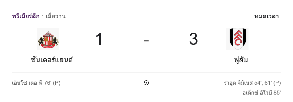 บ้านกีฬา พาเกาะติด ผลบอลสด พรีเมียร์ลีก อังกฤษ เกมที่ซันเดอร์แลนด์เหมือนจะเอาอยู่ในครึ่งแรก แต่พอเข้าครึ่งหลังโดนฟูแล่มเร่งเครื่องแบบไม่ให้หายใจ ก่อนจบด้วยความเจ็บปวด 1-3 จิเมเนซกดสองตุง ส่วนไอโวบี้ย้ำแผลปิดเกมแบบคมกริบ