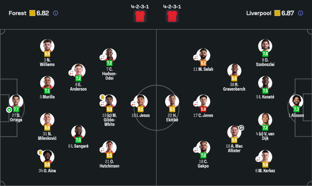 เกมนี้ภาพรวมคือ ฟอเรสต์ตั้งใจเล่นแบบรัดกุม รอจังหวะสวนกลับและเล่นลูกสองจากการปะทะกลางสนาม พวกเขาใช้ความขยันของแอนเดอร์สันกับฮัดสัน โอดอย ช่วยไล่เพรสและลากกินตัวเพื่อหาฟาวล์กับเตะมุม ทำให้ลิเวอร์พูลต้องบุกแบบค่อย ๆ เจาะ ไม่ได้ไหลลื่นตั้งแต่ต้น