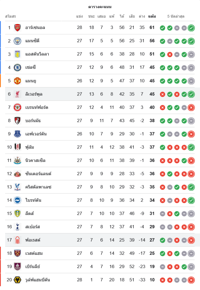 ชัยชนะนัดนี้ทำให้ลิเวอร์พูลเก็บเพิ่มเป็น 45 แต้มจาก 27 นัด รั้งอันดับ 6 และยังเกาะกลุ่มหัวตารางแบบไม่ปล่อยมือ การได้สามแต้มจากเกมที่อึดอัดคือสัญญาณของทีมที่กำลังไล่ล่าพื้นที่ยุโรปอย่างจริงจัง ขณะที่ฟอเรสต์ยังอยู่โซนล่าง อันดับ 17 มี 27 แต้มจาก 27 นัด งานหนีโซนตกชั้นยังไม่จบ และความเจ็บคือพวกเขาเล่นได้ดีพอจะมีแต้ม แต่ดันเสียตอนจบ