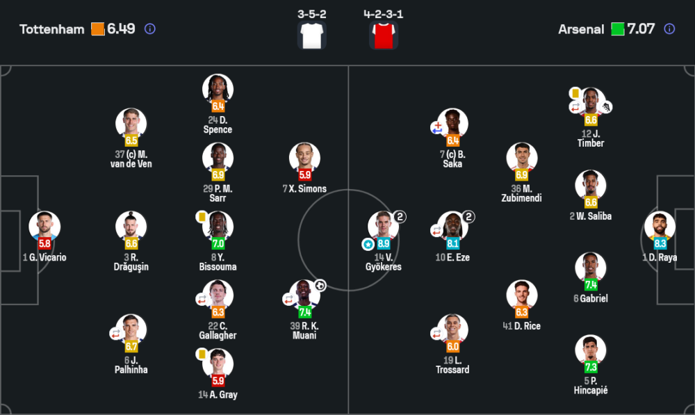 วิคตอร์ กโยเคเรส คือคำตอบเดียวของเกมนี้ จบด้วยผลงานยิง 2 ประตู เรตติ้ง 8.9 ลูกยิงไกลนาที 47 คือจังหวะเปลี่ยนโมเมนตัมให้เกมเอนเข้าฝั่งอาร์เซนอลแบบชัดเจน และประตูปิดกล่องนาที 94 คือความเด็ดขาดที่ทำให้ดาร์บี้กลายเป็นคืนของปืนใหญ่เต็มตัว นอกจากสกอร์ กโยเคเรสยังทำให้แนวรับสเปอร์สต้องถอยและลังเลตลอดว่า จะบีบสูงก็เสี่ยง จะถอยก็เปิดพื้นที่ให้เขาเล่นง่าย