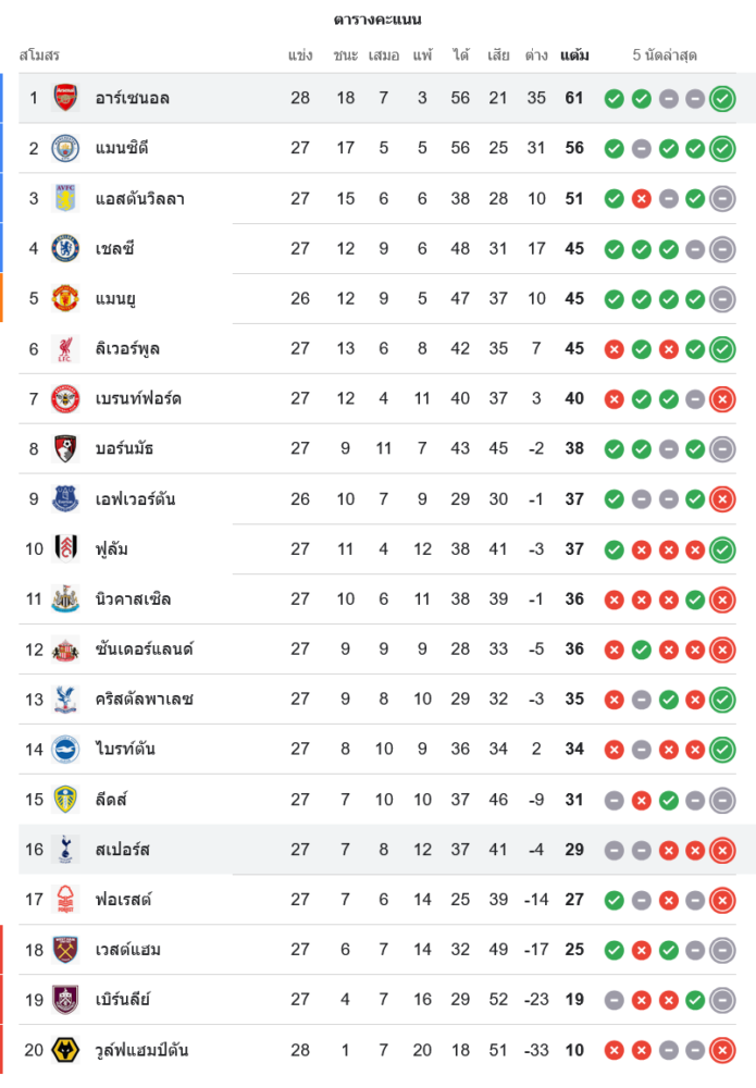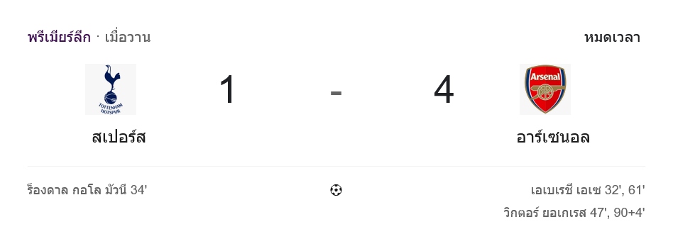 ชัยชนะเกมนี้ส่งอาร์เซนอลยึดจ่าฝูงต่อด้วย 61 แต้มจาก 28 นัด ทิ้งแรงกดดันใส่คู่แข่งแบบตรง ๆ เพราะเกมใหญ่ชนะได้แบบขาดลอยต่างจากการเบียดชนะทั่วไป ส่วนสเปอร์สยังอยู่โซนล่างที่น่าห่วง อันดับ 16 มี 29 แต้มจาก 27 นัด ช่องว่างจากท้ายตารางไม่ได้ปลอดภัยนัก หากยังเสียประตูง่ายและเกมรับหลุดแบบครึ่งหลังนี้ ทุกนัดต่อจากนี้จะกลายเป็นศึกหนีความกดดันแบบเต็มรูปแบบ