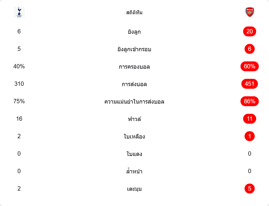 รูปเกมสะท้อนความต่างแบบชัดเจน อาร์เซนอลยิงถึง 20 ครั้ง ขณะที่สเปอร์สมีเพียง 6 ครั้ง แม้เจ้าถิ่นจะยิงเข้ากรอบ 5 ครั้งแต่คุณภาพจังหวะสุดท้ายยังไม่พอจะผ่านราย่าที่เซฟได้หลายครั้ง ด้านการครองบอลทีมเยือนทำได้ 60 เปอร์เซ็นต์ พร้อมจ่ายบอล 451 ครั้งและความแม่นยำ 86 เปอร์เซ็นต์ ทำให้คุมจังหวะเกมได้ตลอด ส่วนสเปอร์สครองบอล 40 เปอร์เซ็นต์ จ่าย 310 ครั้ง ความแม่นยำ 75 เปอร์เซ็นต์จึงต่อบอลไล่เพรสได้ยาก เรื่องวินัยเกมรับ สเปอร์สทำฟาวล์ 16 ครั้งมากกว่าอาร์เซนอล 11 ครั้ง และได้ใบเหลือง 2 ใบ ขณะที่ทีมเยือนมี 1 ใบ ลูกเตะมุมก็เป็นอาร์เซนอลที่ได้มากกว่า 5 ต่อ 2 ย้ำว่าบุกกดดันต่อเนื่องทั้งเกม
