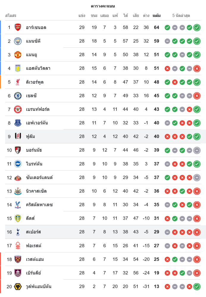สถานการณ์ในตารางคะแนนพรีเมียร์ลีก อังกฤษ
