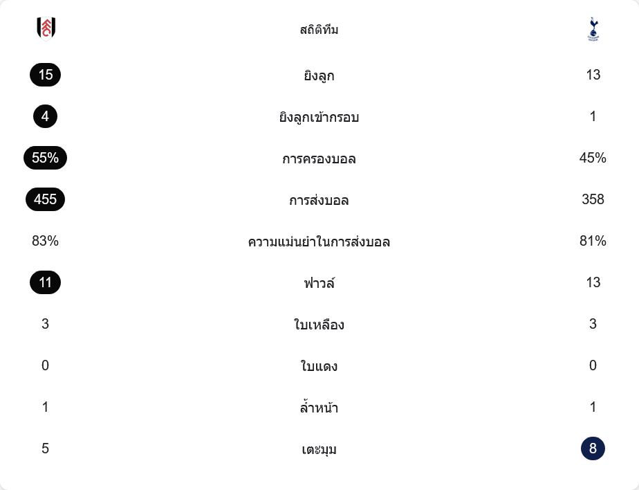 เกมนี้ฟูแล่มยิงทั้งหมด 15 ครั้ง เข้ากรอบ 4 ครั้ง ขณะที่สเปอร์สยิง 13 ครั้งแต่เข้ากรอบเพียง 1 ครั้ง ภาพนี้สะท้อนความต่างของความคมในพื้นที่สุดท้าย ฟูแล่มครองบอล 55% ส่งบอล 455 ครั้ง ความแม่นยำ 83% ส่วนสเปอร์สครองบอล 45% ส่งบอล 358 ครั้ง ความแม่นยำ 81% ด้านวินัยเกมรับ ฟูแล่มทำฟาวล์ 11 ครั้ง สเปอร์ส 13 ครั้ง ใบเหลืองเท่ากันทีมละ 3 ใบ ไม่มีใบแดง ทั้งสองทีมล้ำหน้าทีมละ 1 ครั้ง และสเปอร์สได้เตะมุมมากกว่า 8 ต่อ 5 ซึ่งเป็นแรงกดดันช่วงท้ายเกม แต่ไม่พอจะเปลี่ยนผลการแข่งขันได้