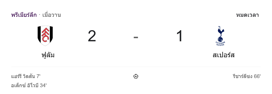 ทดเวลา 6 นาที สเปอร์สโหมกดดันเต็มแรง นาที 96 ได้เตะมุมกดใส่ต่อเนื่อง และจังหวะท้ายเกมจริง ๆ นาที 97 ชูเอา ปาลินญ่ายิงในกรอบแต่โดนบล็อก กลายเป็นฉากปิดก่อนหมดเวลา ฟูแล่มรักษาสกอร์ 2-1 ได้แบบระทึก และแฟน ๆ เช็ก บ้านผลบอล แล้วคงได้ยิ้ม เพราะนี่คือสามแต้มที่ต้องใช้หัวใจล้วน ๆ