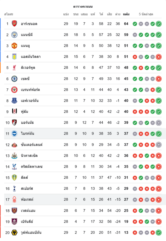 สถานการณ์ในตารางคะแนนพรีเมียร์ลีก อังกฤษ