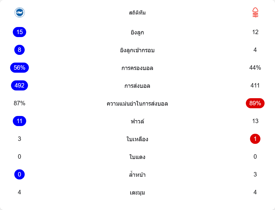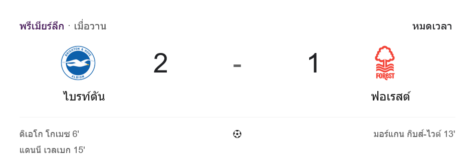 เกมนี้คืออีกหนึ่งหลักฐานว่าในลีกนี้ ใครคมก่อนมีสิทธิ์กินข้าวก่อน ไบรท์ตันจัดสองหมัดไวแล้วเอาตัวรอดได้จนจบ ส่วนฟอเรสต์ต้องกลับไปแก้เรื่องความแน่นในเกมรับและความเด็ดขาดตอนโถมบุกช่วงท้าย แฟนบอลที่อยากตามทุกจังหวะอัปเดต บ้านผลบอล แบบถึงอารมณ์ ติดตามได้ที่ บ้านกีฬา มีครบทั้งสรุปหลังเกม ตารางคะแนน และเรื่องร้อน ๆ ของพรีเมียร์ลีกทุกวัน