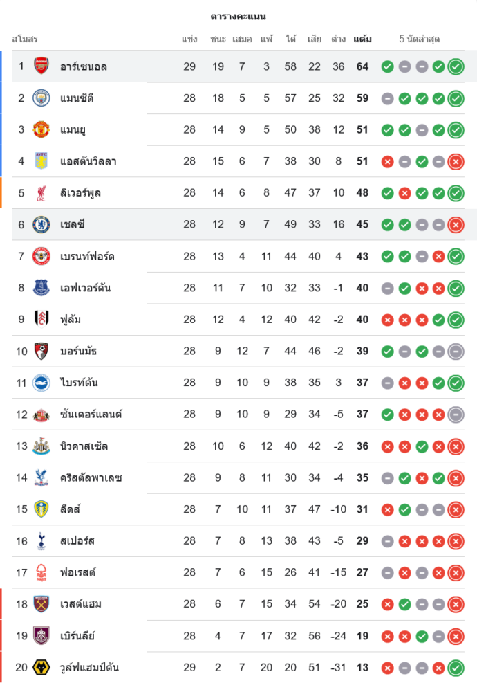 สถานการณ์ในตารางคะแนนพรีเมียร์ลีก อังกฤษ