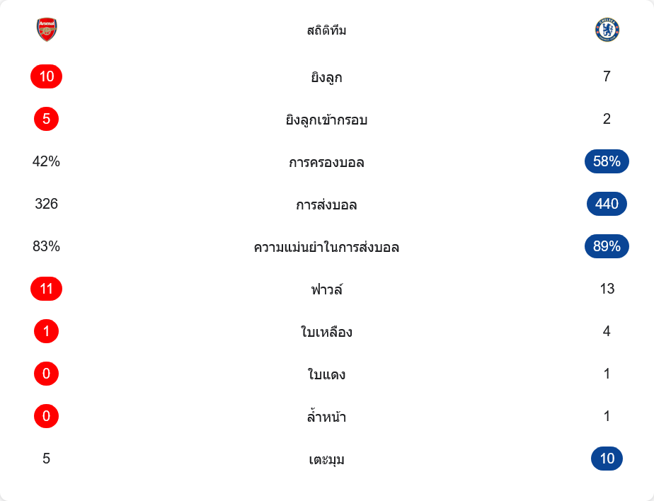 รูปเกมสะท้อนชัดว่าเชลซีเป็นฝ่ายครองบอลมากกว่า 58 เปอร์เซ็นต์ และจ่ายบอลมากถึง 440 ครั้งด้วยความแม่นยำ 89 เปอร์เซ็นต์ แต่ความอันตรายในกรอบยังไม่พอ เพราะยิงเข้ากรอบได้เพียง 2 ครั้งจากโอกาสทั้งหมด 7 ครั้ง ขณะที่อาร์เซนอลครองบอลน้อยกว่าแต่เล่นแบบมีเป้าหมาย ยิงรวม 10 ครั้ง เข้ากรอบ 5 ครั้ง แถมได้ลูกเตะมุม 5 ครั้งซึ่งเปลี่ยนเป็น 2 ประตู ส่วนวินัยเกมหนักก็เดือดทั้งคู่ เชลซีทำฟาวล์ 13 ครั้งและโดนใบเหลืองถึง 4 ใบ ก่อนจบด้วยใบแดง 1 ใบ กลายเป็นภาพรวมที่บอกว่า ทีมเยือนคุมบอลได้แต่คุมอารมณ์ไม่อยู่