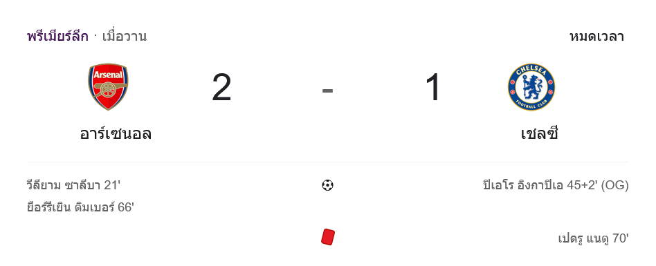 ช่วงท้ายเชลซีพยายามฮึด มีเตะมุมและจังหวะโยนกดดัน แต่แนวรับอาร์เซนอลยืนกันเป็นกำแพง สุดท้ายปืนใหญ่ประคองเกมอยู่จนจบ คว้าชัย 2-1 แบบสะใจแฟนบ้านผลบอลสายปืนใหญ่เต็ม ๆ