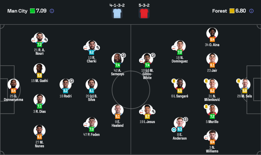 แต่ซิตี้เอาคืนเร็ว นาที 62 ขึ้นนำ 2-1 จากลูกเตะมุม Rayan Aït-Nouri เปิดเข้ามาให้ Rodri โหม่งจ่อ ๆ กลางประตูไม่พลาด ทว่าเกมยังไม่จบง่าย นาที 76 ฟอเรสต์ไล่ตีเสมอ 2-2 แบบสะใจแฟนทีมเยือน เมื่อ Callum Hudson-Odoi แอสซิสต์ให้ Elliot Anderson กดไกลนอกกรอบ บอลพุ่งเสียบมุมล่างขวา