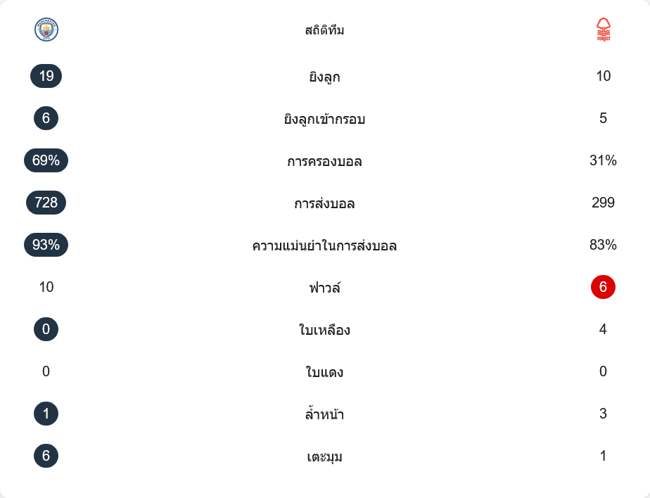เกมนี้แมนฯ ซิตี้เป็นฝ่ายครองบอลเหนือกว่าชัดเจน 69% ต่อ 31% พร้อมจำนวนการส่งบอล 728 ครั้งมากกว่าฟอเรสต์ที่ 299 ครั้ง และความแม่นยำในการจ่ายบอลของเจ้าถิ่นก็สูงถึง 93% ขณะที่ทีมเยือนอยู่ที่ 83% ซิตี้ยิงรวม 19 ครั้ง เข้ากรอบ 6 หน ส่วนฟอเรสต์ยิง 10 ครั้ง เข้ากรอบ 5 หน แปลว่าแม้โอกาสจะน้อยกว่า แต่ความเฉียบคมและการเลือกจังหวะยิงของทีมเยือนทำให้เกมไม่หลุดมือ