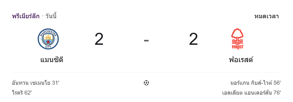 ช่วงท้ายซิตี้บุกหนัก นาที 86 Guéhi โขกหลุดกรอบ นาที 96 Semenyo ปั่นฟรีคิกชนคานแบบดังสนั่น และช่วงทดเจ็บยังมีจังหวะยิงติดบล็อกในกรอบหลายครั้ง แต่ฟอเรสต์ช่วยกันเคลียร์จนสิ้นเสียงนกหวีด จบเกม 2-2 แบบมันส์ทะลุเพดาน