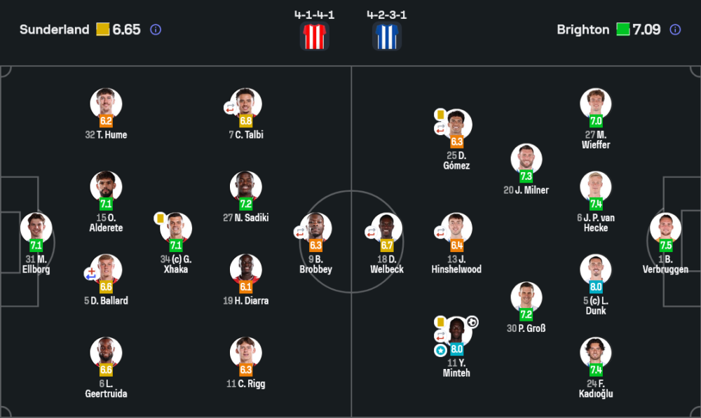 ไบรท์ตันยืน 4-2-3-1 และเล่นอย่างมีวินัยมากกว่า พวกเขาไม่ได้บุกแบบต่อเนื่องหนัก ๆ แต่เลือกจังหวะเข้าทำได้คมกว่า เกมรุกริมเส้นของมินเตห์สร้างปัญหาให้ซันเดอร์แลนด์ตลอด และสุดท้ายก็เป็นเขาที่ตัดสินเกมได้สำเร็จ