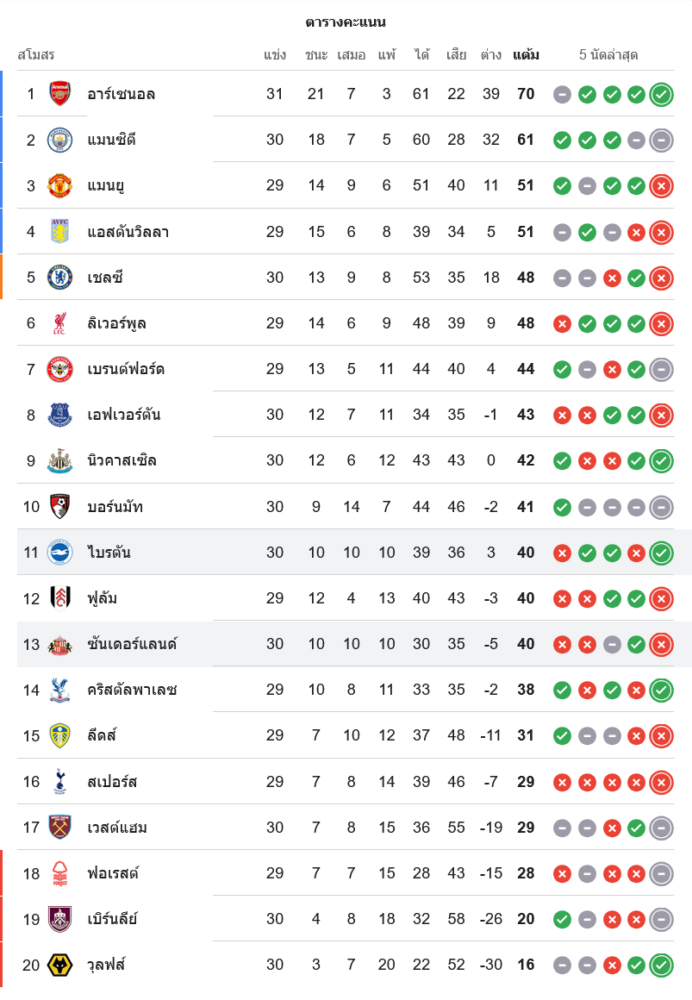 สถานการณ์ในตารางคะแนนพรีเมียร์ลีก อังกฤษ