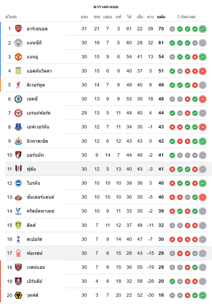 สถานการณ์ในตารางคะแนนพรีเมียร์ลีก อังกฤษ