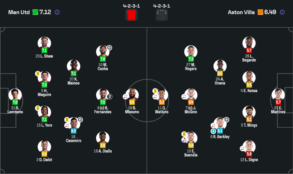 แมนยูไนเต็ดมาในระบบ 4-2-3-1 และชัดเจนว่า บรูโน่ แฟร์นันด์ส คือศูนย์กลางของเกมรุก เขาเชื่อมบอลจากแดนกลางสู่พื้นที่สุดท้ายได้ต่อเนื่อง ขณะที่ คาเซมิโร่ กับ ไมนู ช่วยคุมจังหวะและตัดเกมไม่ให้วิลล่าขึ้นบอลง่าย
